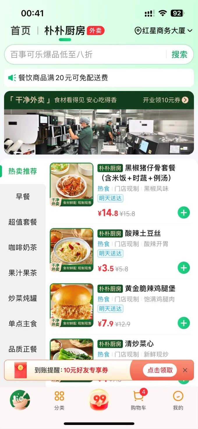 朴朴厨房走的是自营路线,主打“食材鲜配,现制现售”,定价亲民,一份中式米饭套餐大多在13-20元以内。这与京东七鲜小厨的“品质化”路线、美团浣熊食堂的集合式外卖场地模式形成差异化。