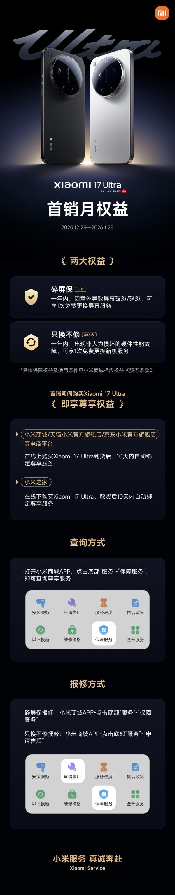 【CNMO科技消息】12月29日,小米集团合伙人、总裁,手机部总裁,小米品牌总经理卢伟冰宣布,小米17 Ultra正式推出首销月专属权益计划,覆盖2025年12月25日至2026年1月25日的购买用户。该计划包含两大核心服务:“碎屏保”与“只换不修”。