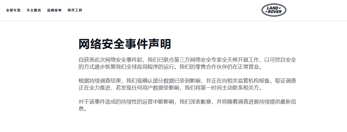 捷豹路虎发布声明称,自获悉此次网络安全事件起,我们已联合第三方网络安全专家全天候开展工作,以可控且安全的方式逐步恢复我们全球应用程序的运行。我们的零售合作伙伴仍在正常营业。根据持续调查结果,我们现确认部分数据已受到影响,并正在向相关监管机构报备。取证调查正在全力推进,若发现任何用户数据受影响,我们将第一时间主动联系相关方。